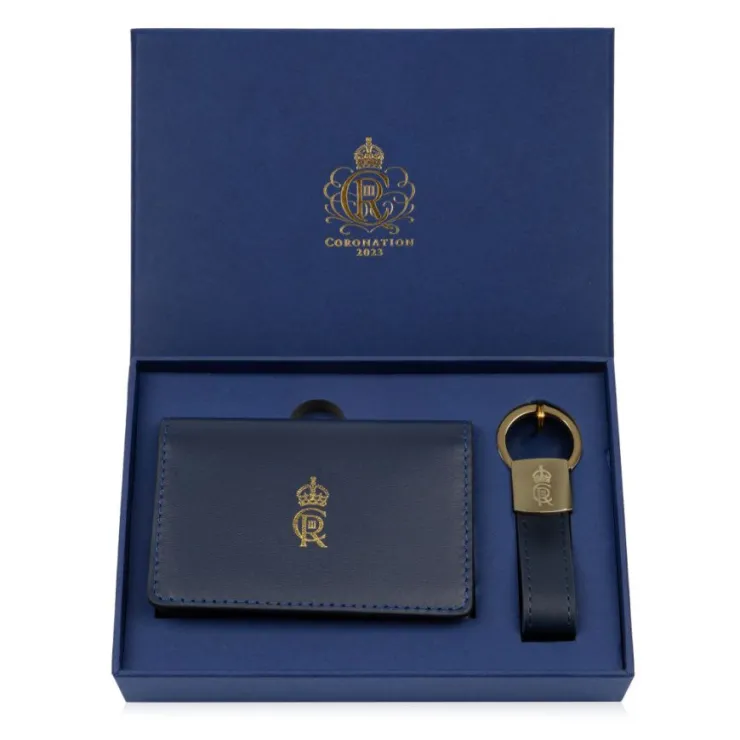 Leather Card Wallet And Keyring Set, Featuring King Charles Iii’S Cypher Embossed In Gold On Leather. Gold Plated Kerying And Diamond Engraved.