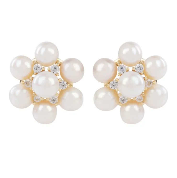 Stud Earrings With White Pearls Forming The Petals Of The Flower And A Cubic Zirconia In The Centre.